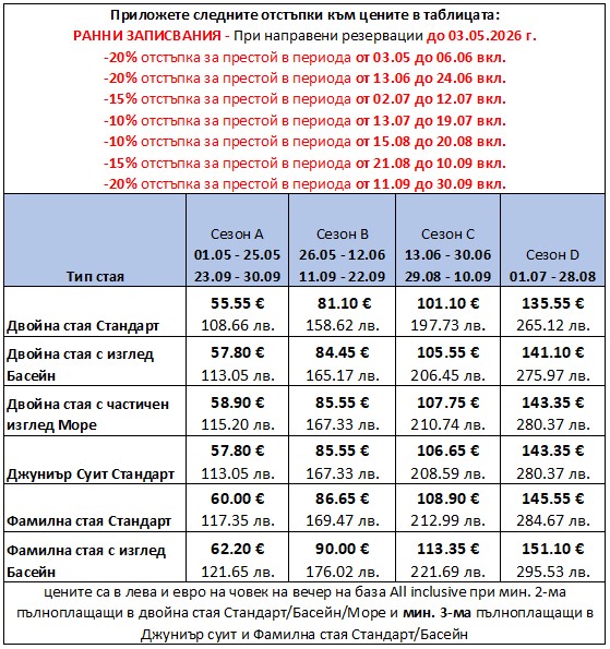 - За периода 26.05.2026 - 16.06.2026: Офертата е валидна при минимален престой от 4 нощувки