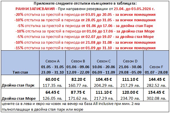 - Офертата важи само за нови резервации направени след 24.04.2026 г.