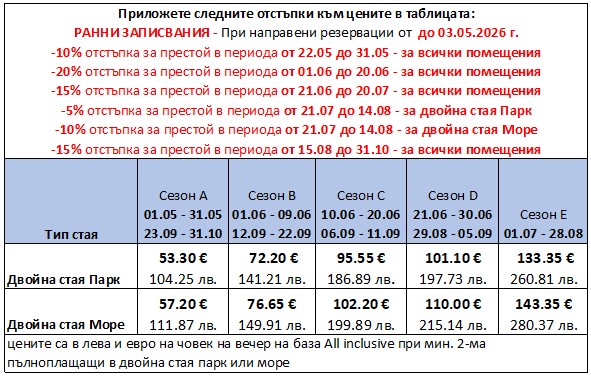 - Офертата е валидна при минимум двама пълноплащащи настанени в двойна стая парк/море