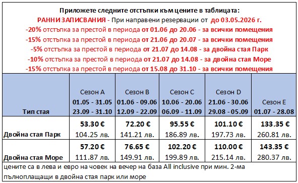 • при престой от 7+ нощувки получавате допълнителна отстъпка от 5 % намаление  (важи за пристигане в периодите 21.06-05.09)