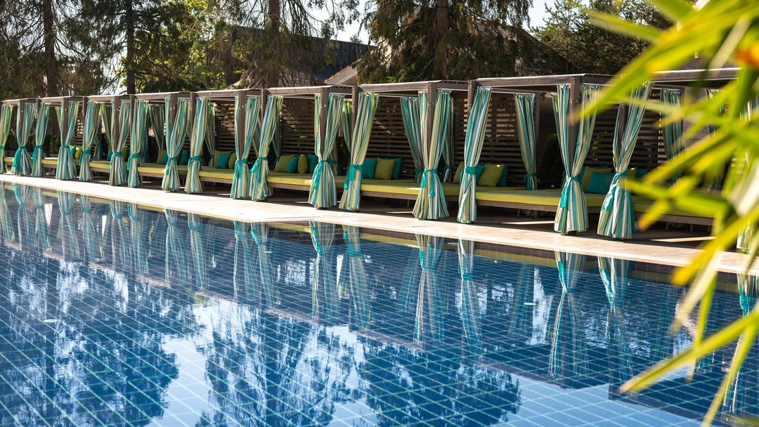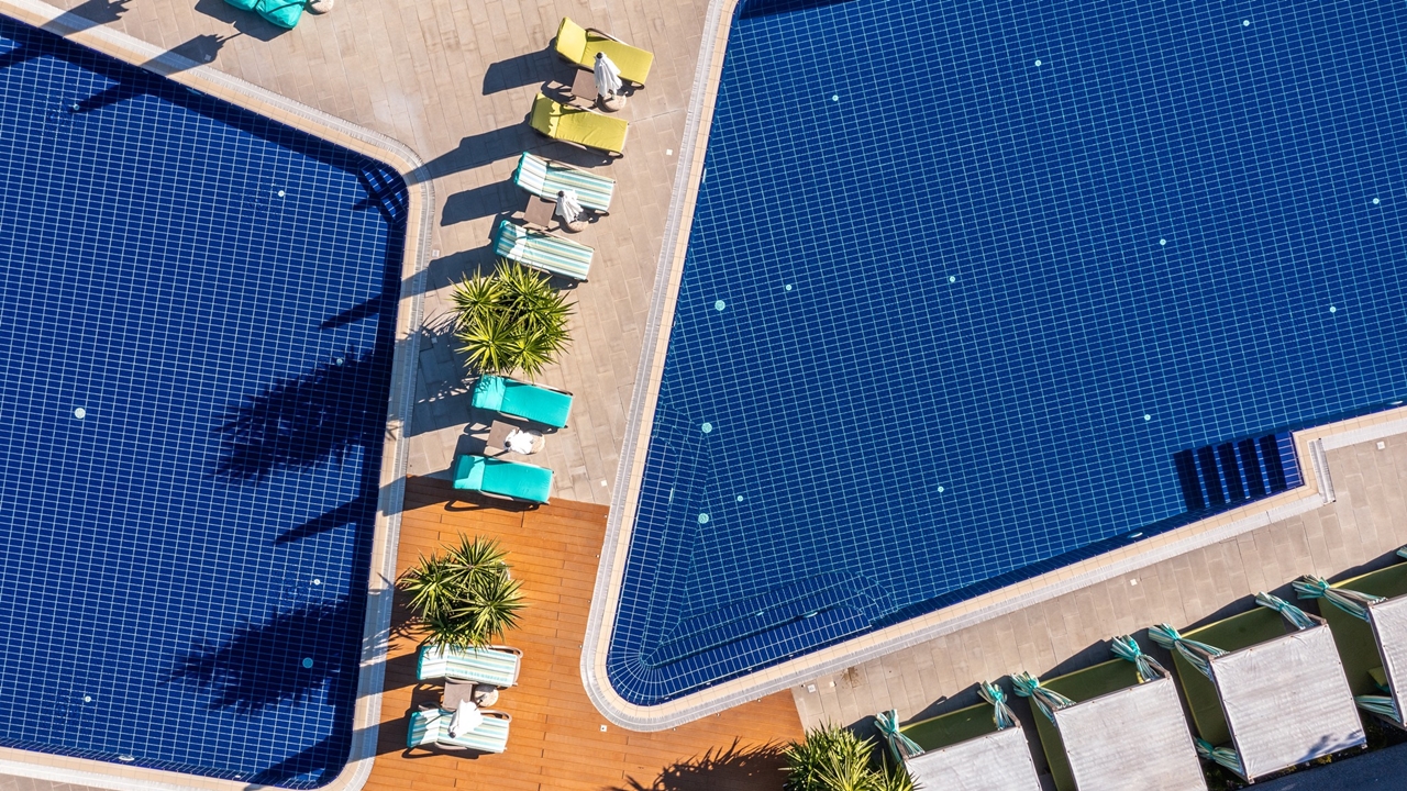- Чадъри и шезлонги край басейните