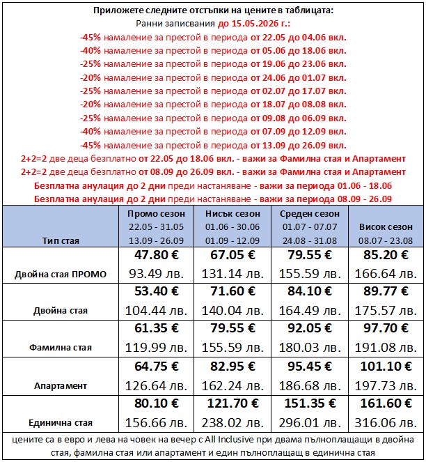 - За периода 01.07.2026 - 31.08.2026: Офертата е валидна при минимален престой от 4 нощувки
