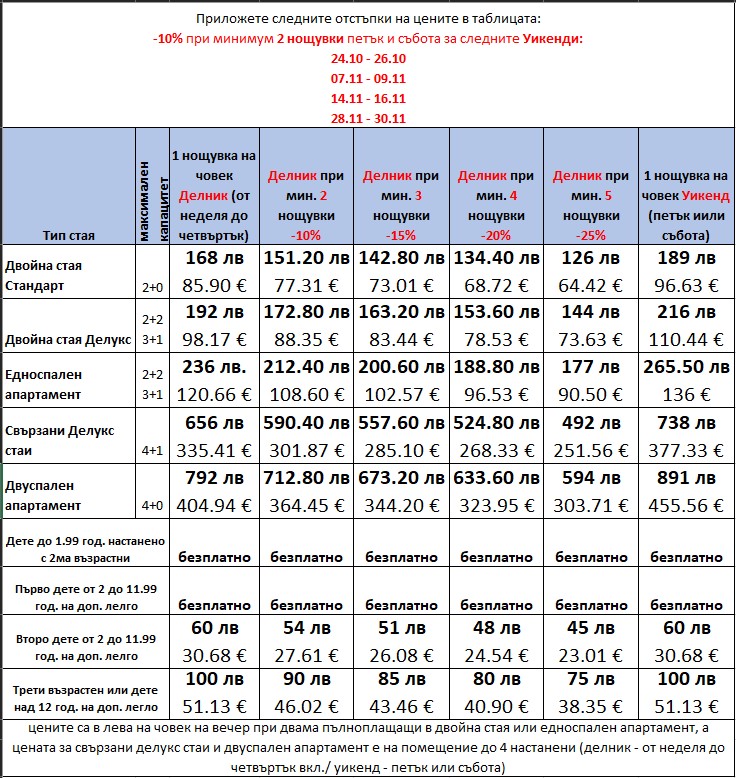 - За периода 31.10.2025 - 02.11.2025: Есенна Ваканция - Офертата не важи, за цена попитайте наш консултант (тел. 024111600)