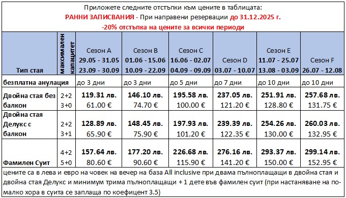 Цени за други помещения и периоди виж секция "Условия на офертата" |